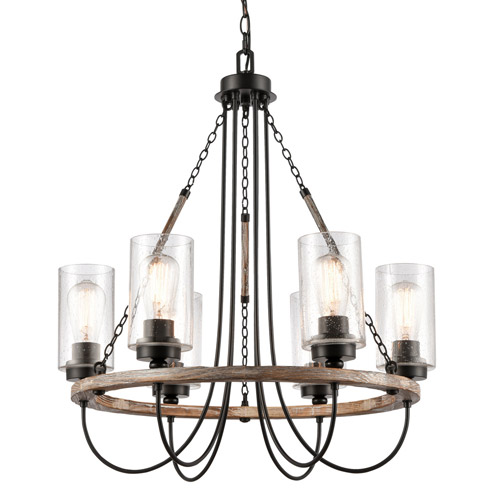 6-Light Chandelier in Matte Black with Wood Band and Seedy Glass Shades